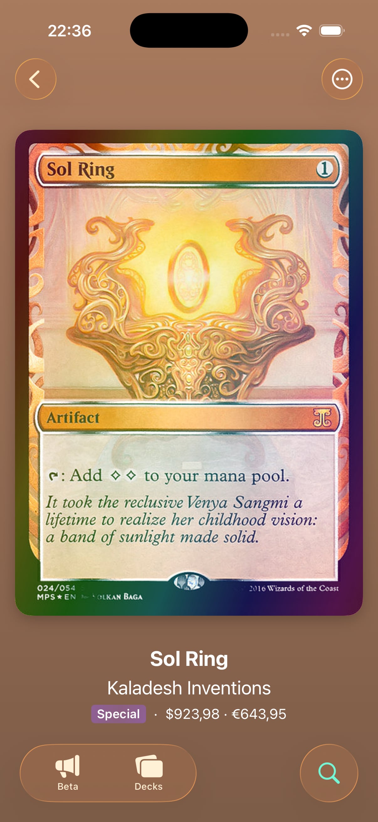 Current market prices for every card, in both Euro and Dollar. At a glance on search results, and in full detail on the card view — so you always know what you're holding.*